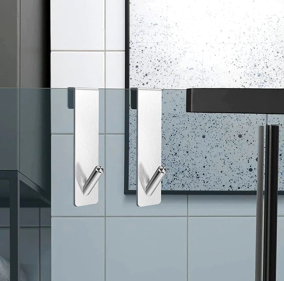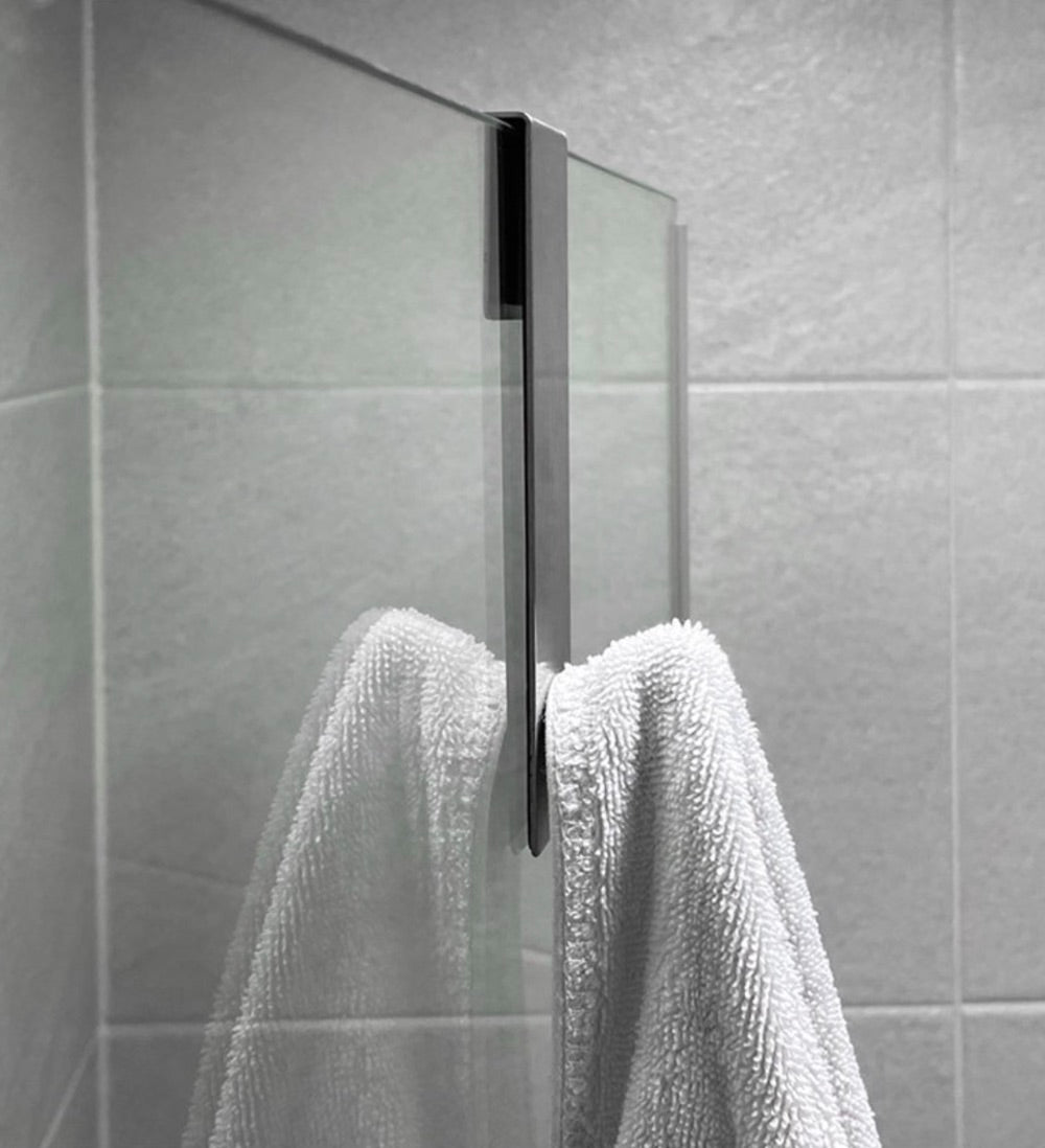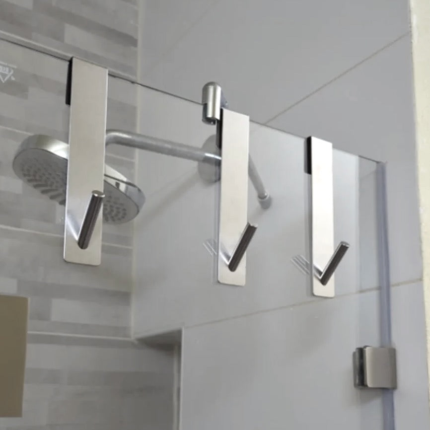 Crochet en acier inoxydable pour porte de douche en verre, installation sans perçage, design moderne antirayures, idéal pour suspendre serviettes, peignoirs et accessoires de salle de bain. Livraison offerte !